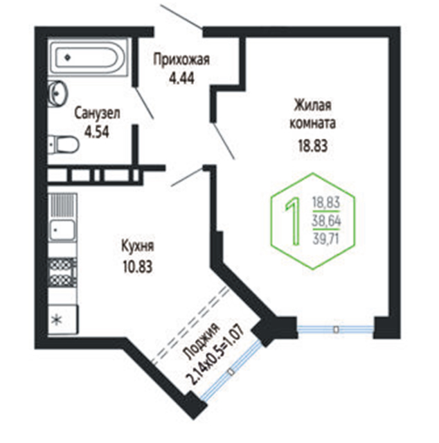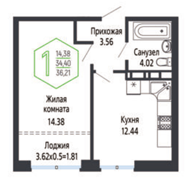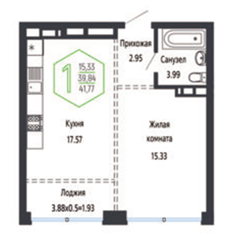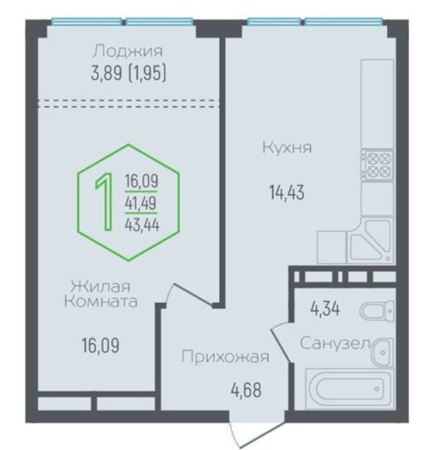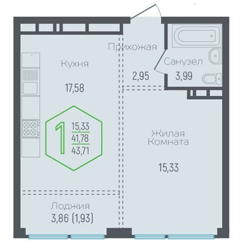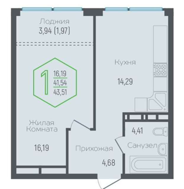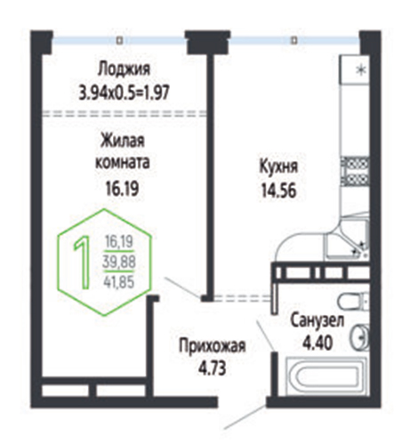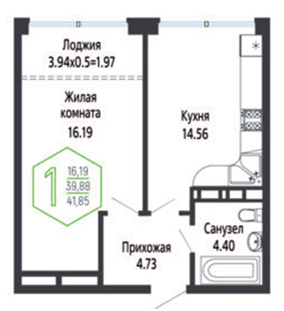 1 41.94 / 16.19 м² от 8 388 000 руб. (200 000 руб./м²) Планировка