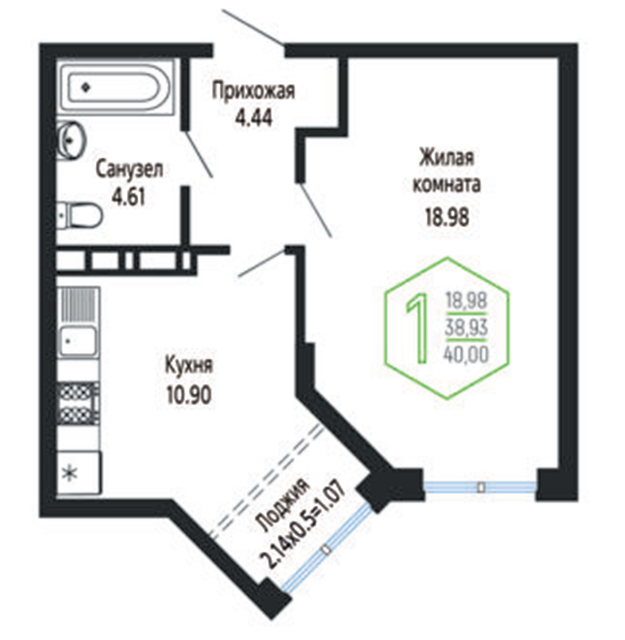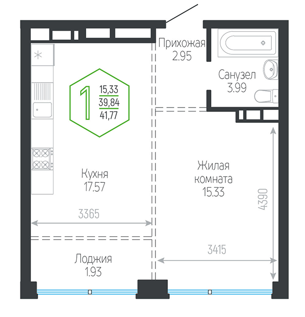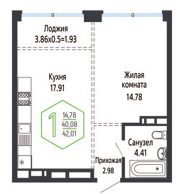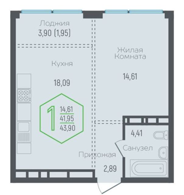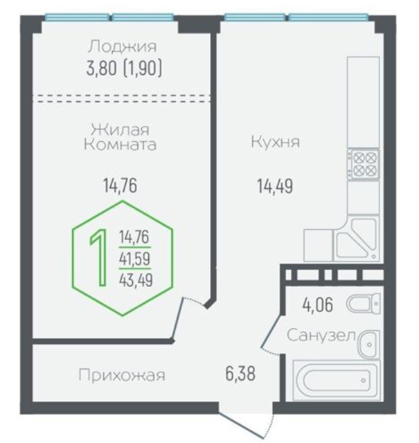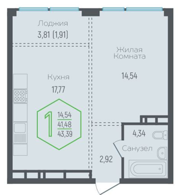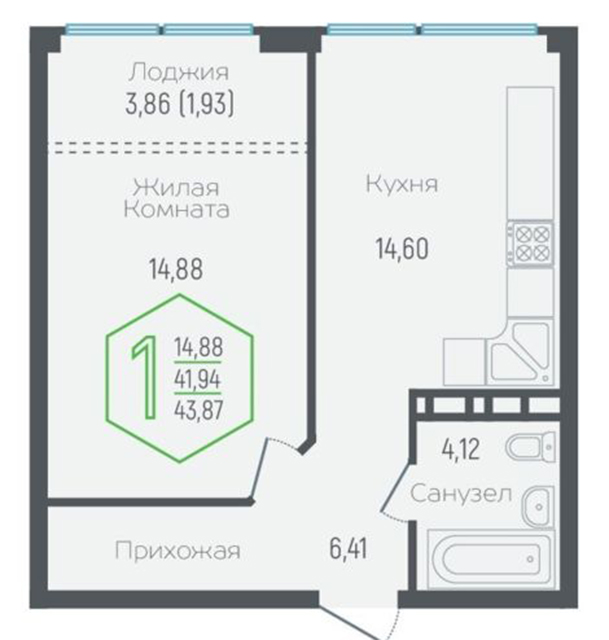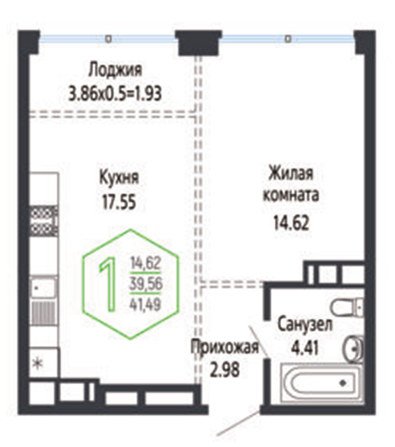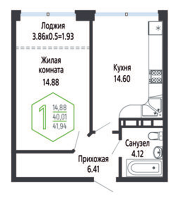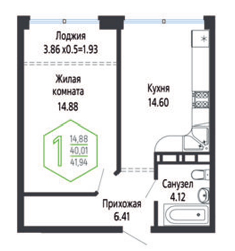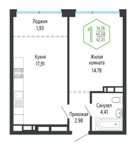 1 41.54 / 14.76 м² от 9 761 900 руб. (235 000 руб./м²) Планировка