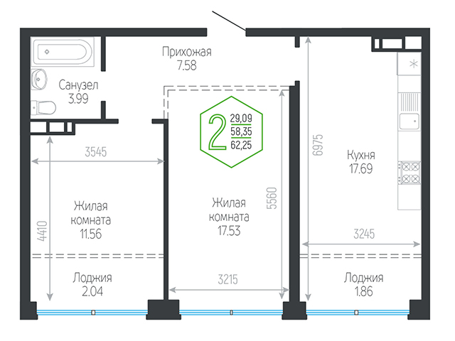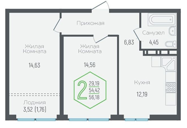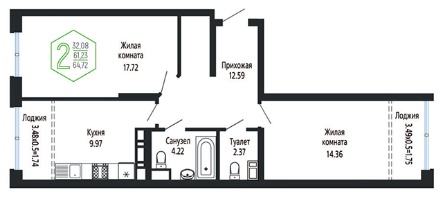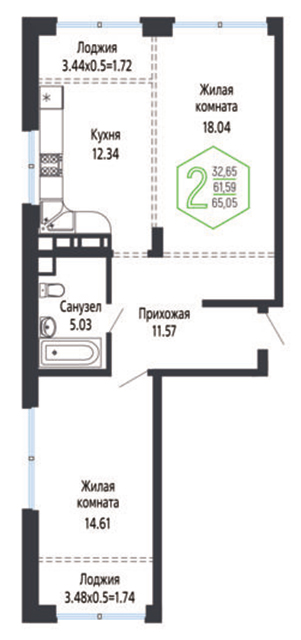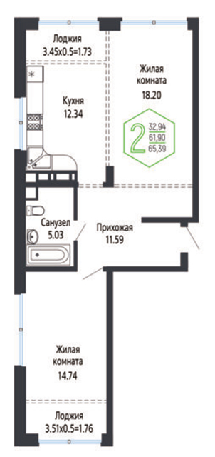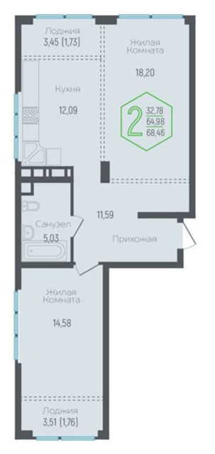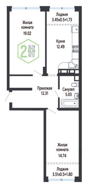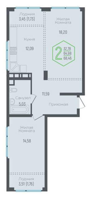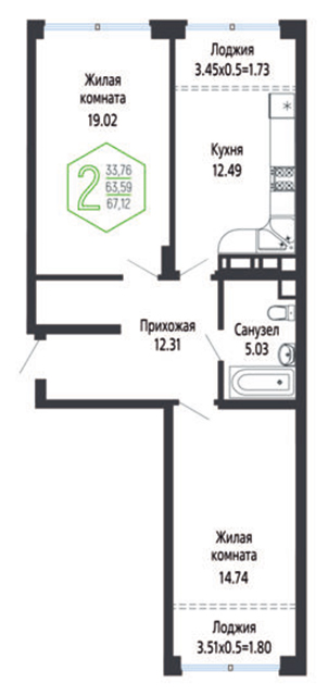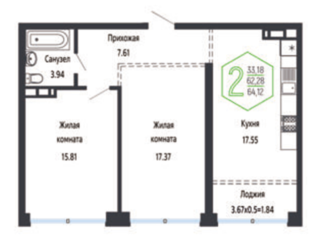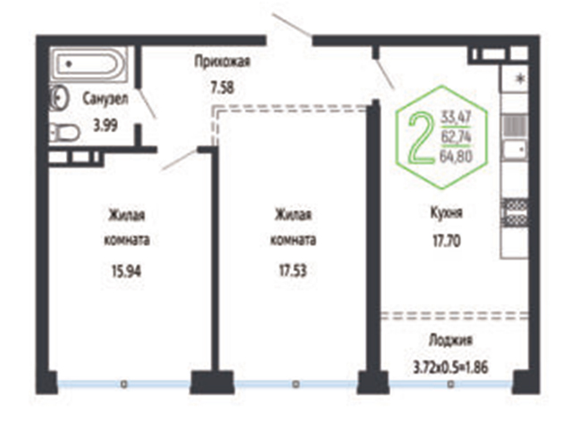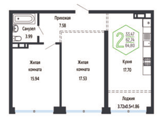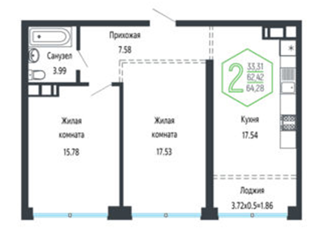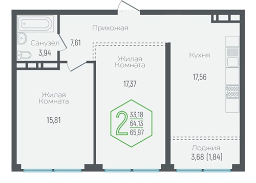 2 64.12 / 33.18 м² от 11 541 600 руб. (180 000 руб./м²) Планировка