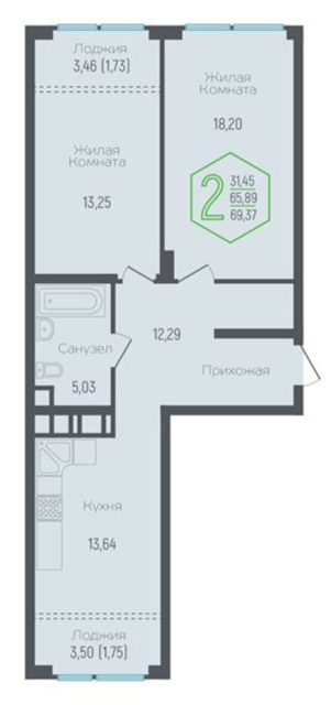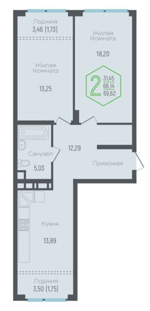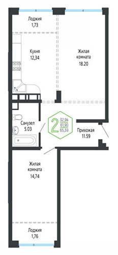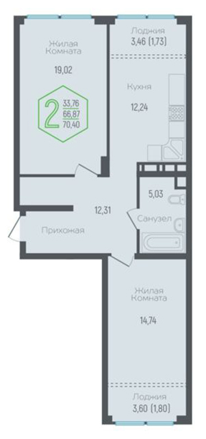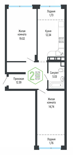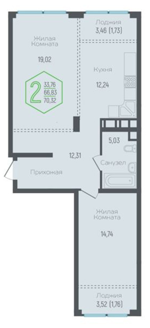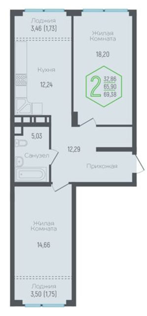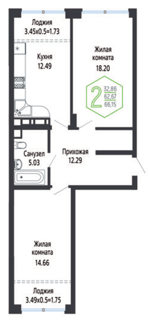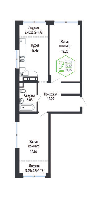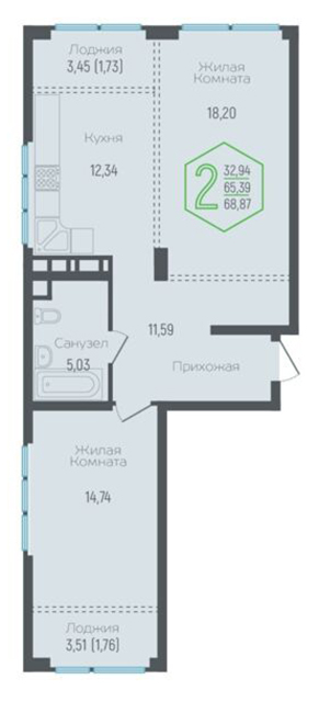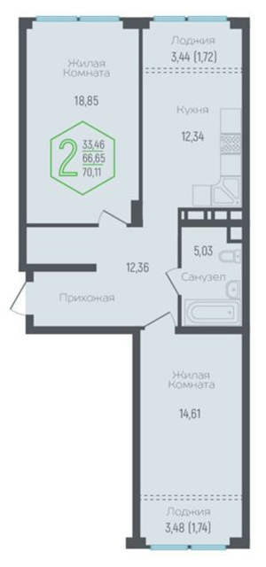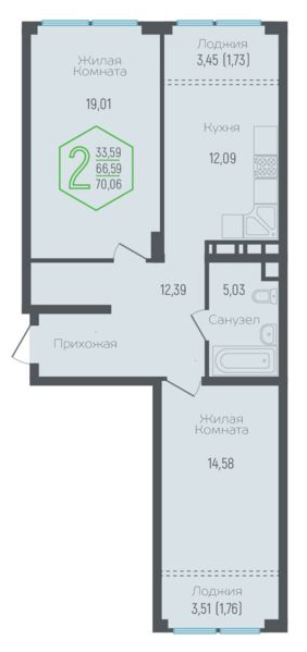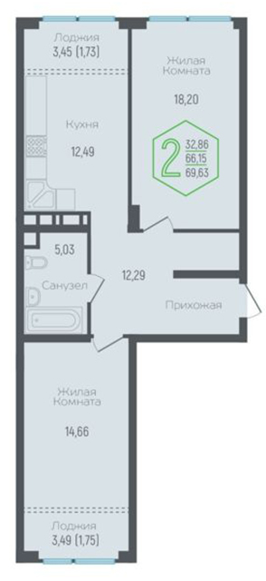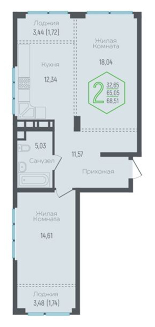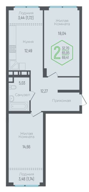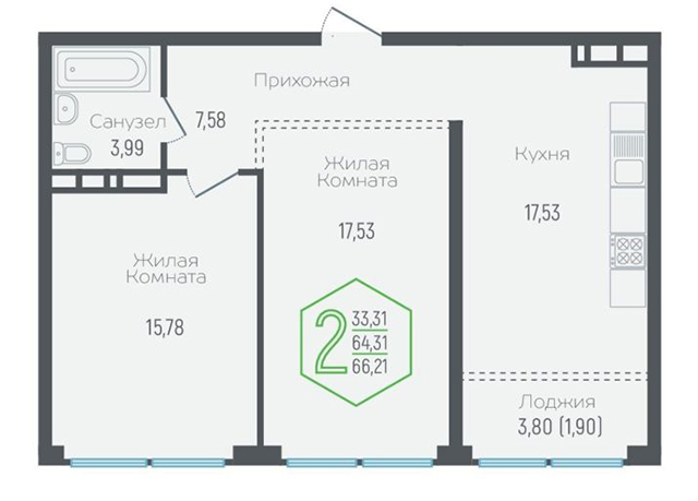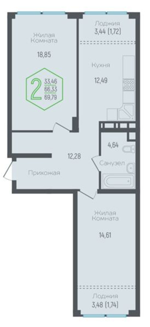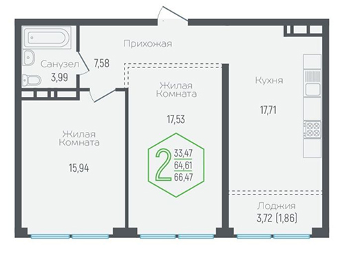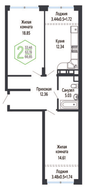 2 66.15 / 33.76 м² от 12 237 750 руб. (185 000 руб./м²) Планировка