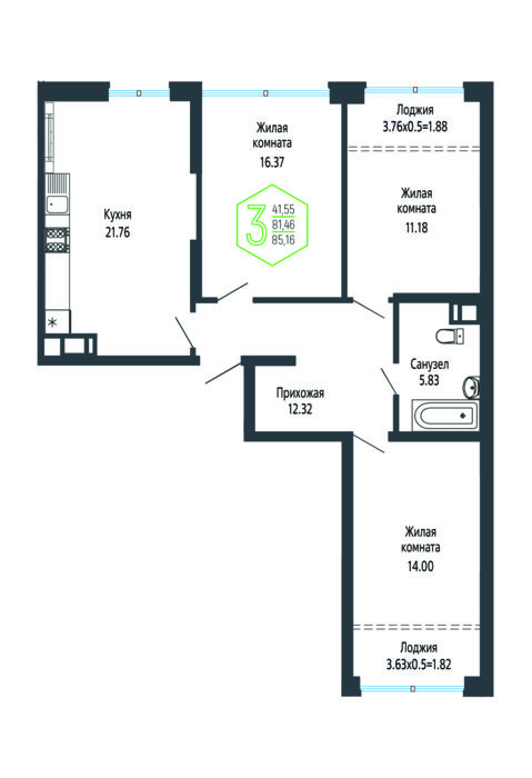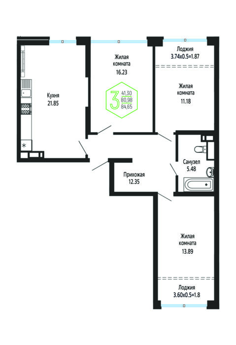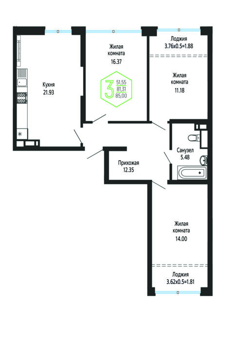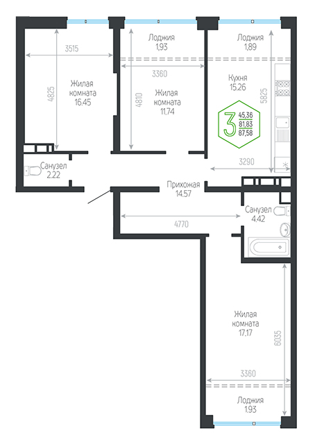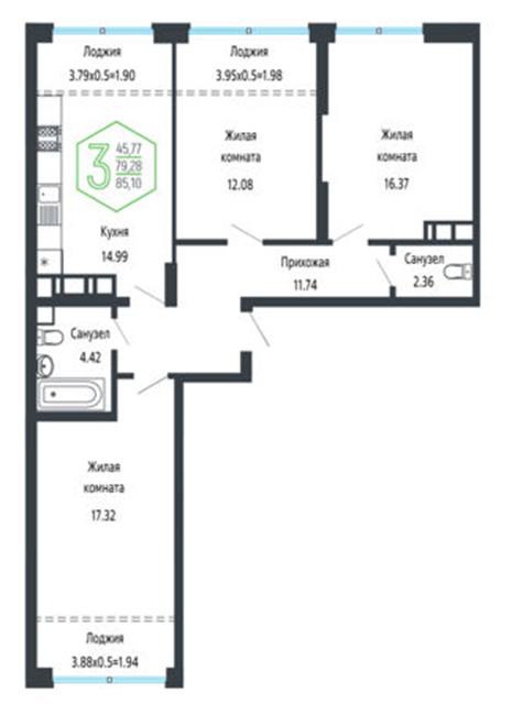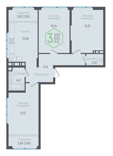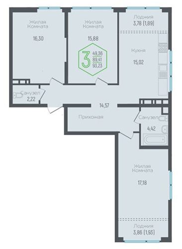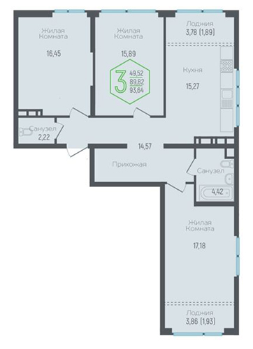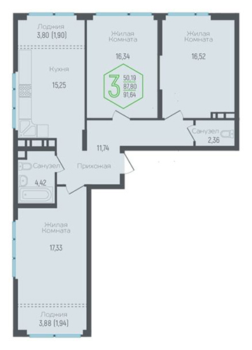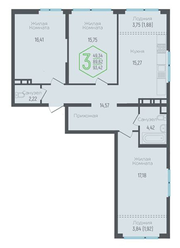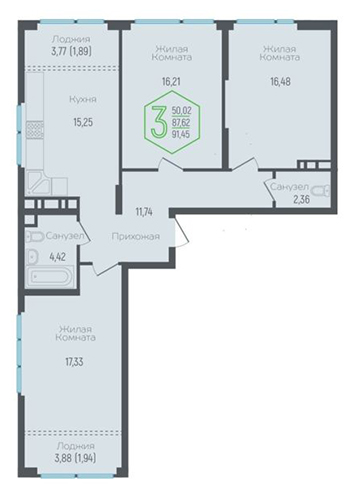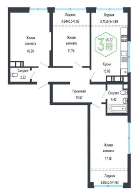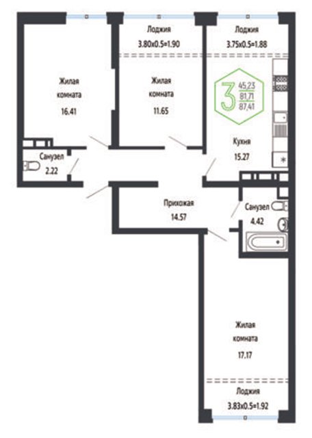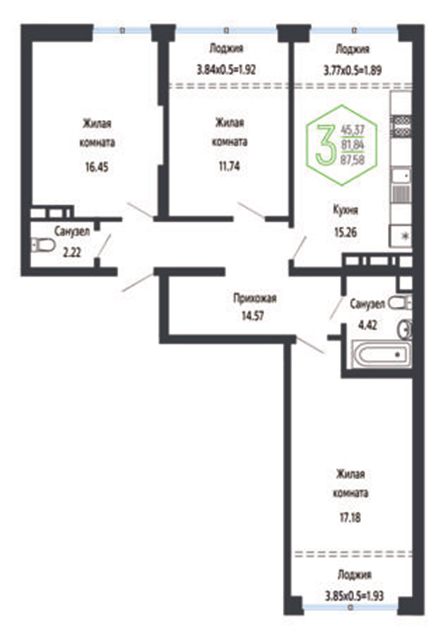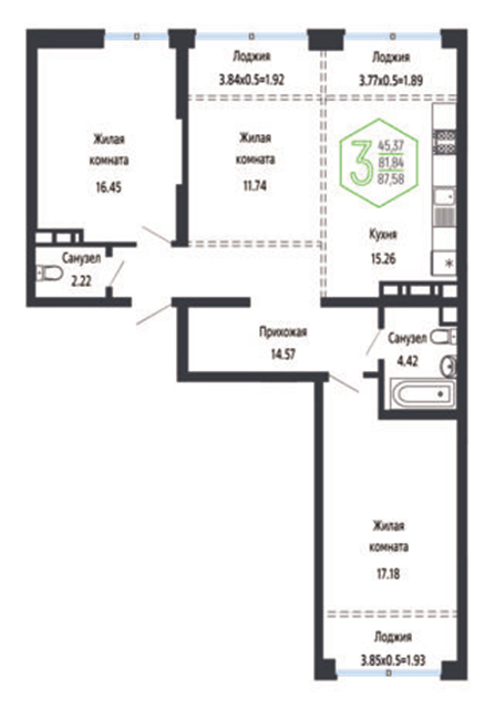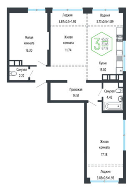 3 87.41 / 45.77 м² от 14 859 700 руб. (170 000 руб./м²) Планировка