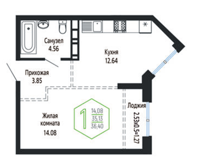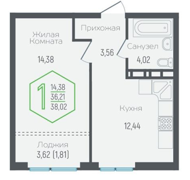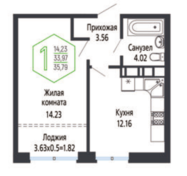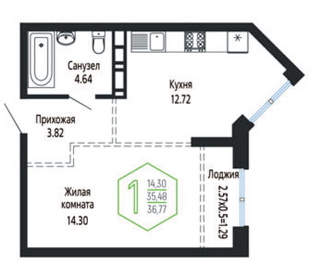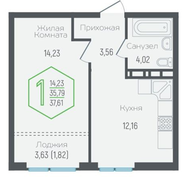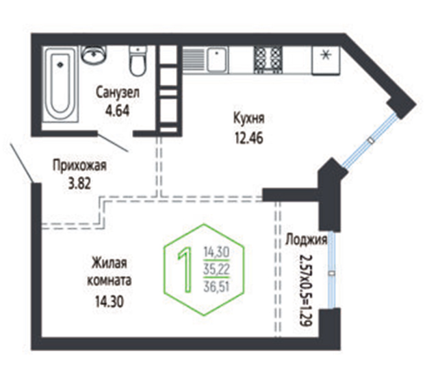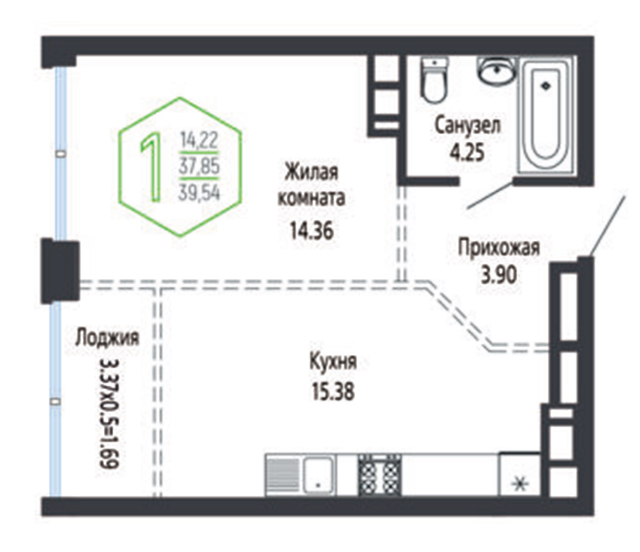 1 36.69 / 14.23 м² от 8 989 050 руб. (245 000 руб./м²) Планировка