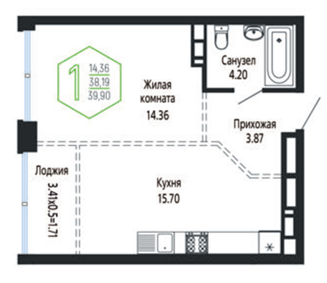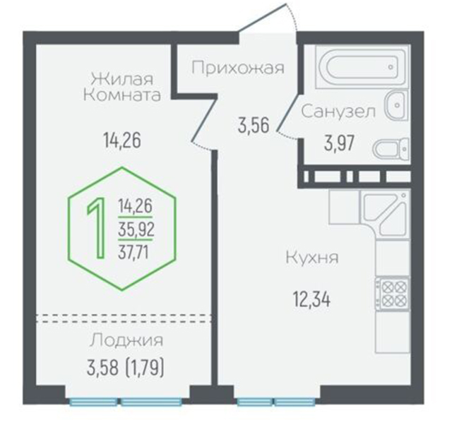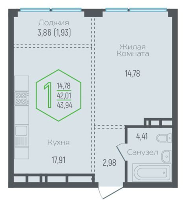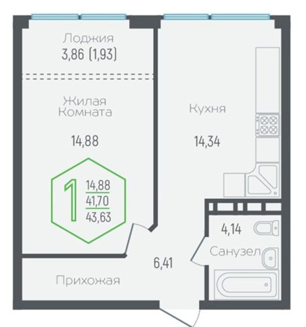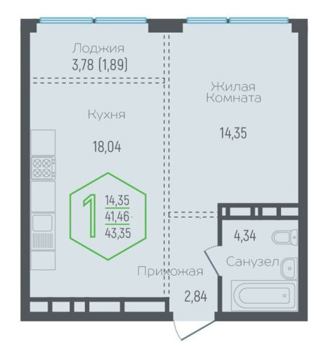 1 41.94 / 14.35 м² от 9 017 100 руб. (215 000 руб./м²) Планировка