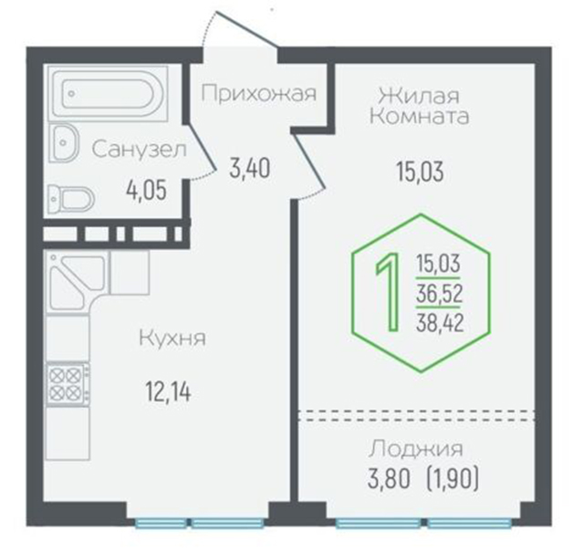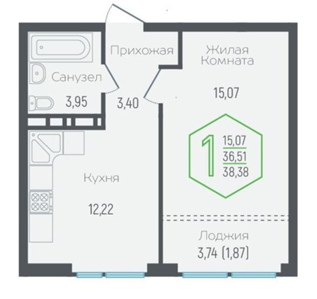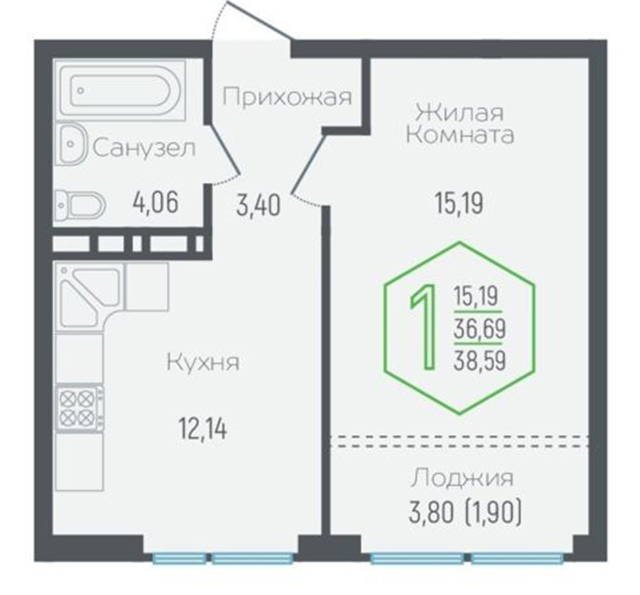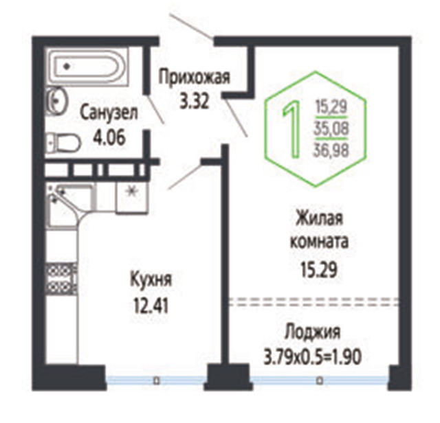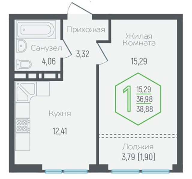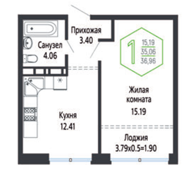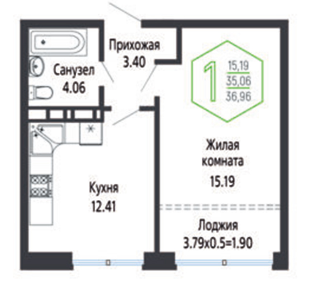 1 36.96 / 15.19 м² от 8 316 000 руб. (225 000 руб./м²) Планировка