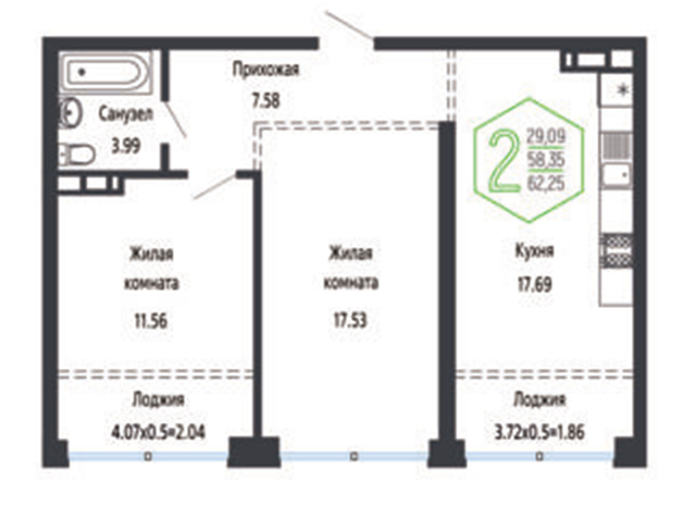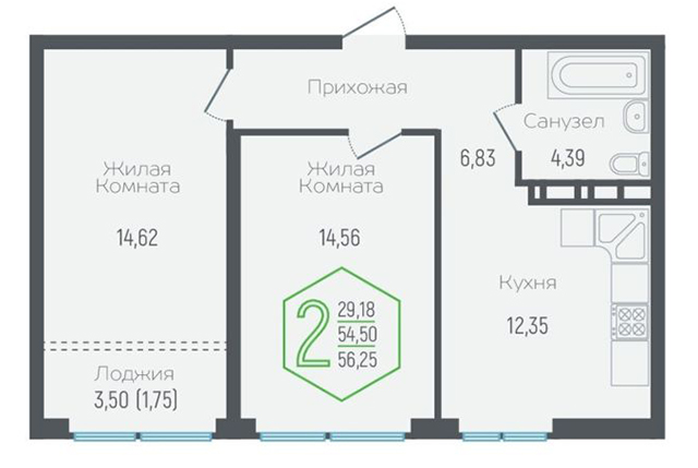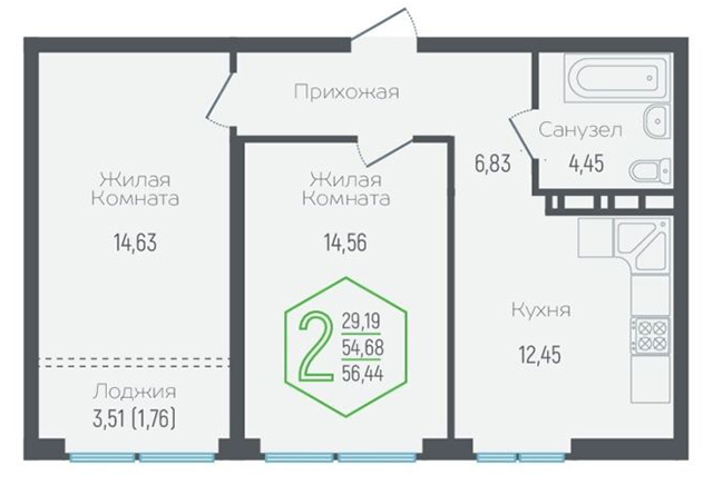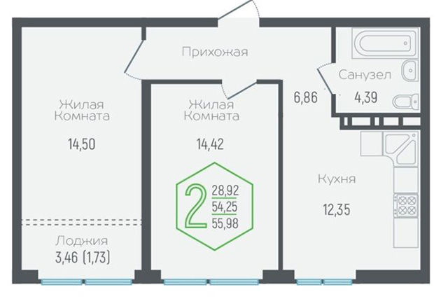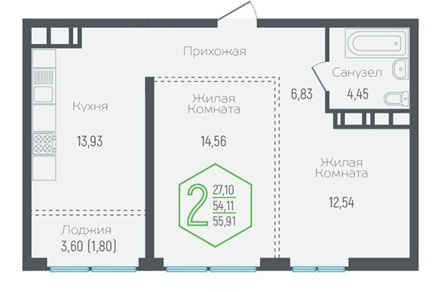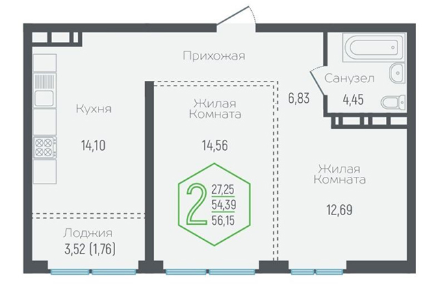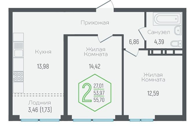 2 54.68 / 27.01 м² от 10 717 280 руб. (196 000 руб./м²) Планировка