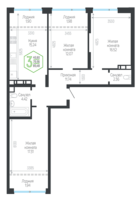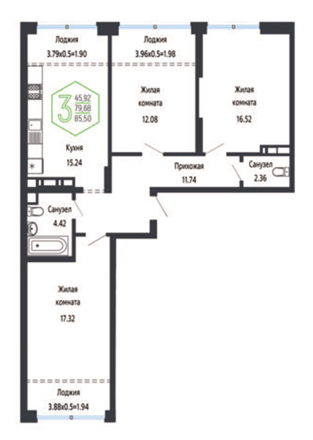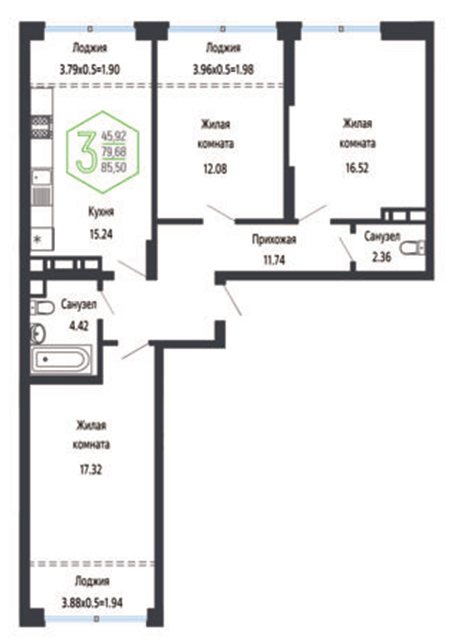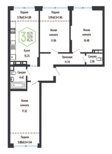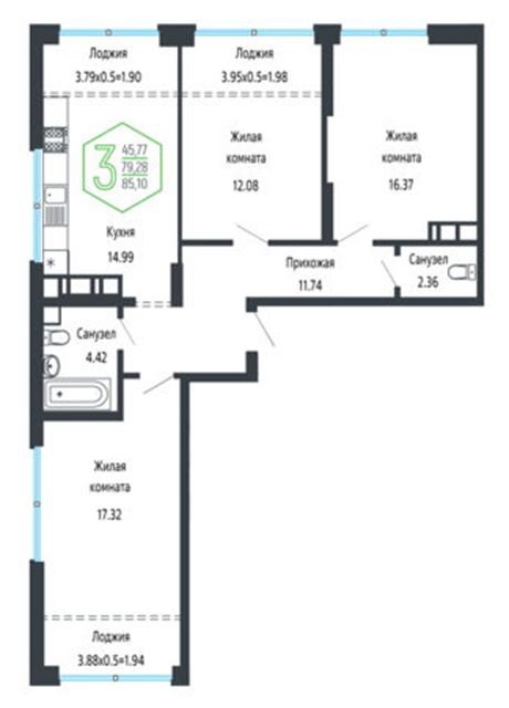 3 85.34 / 45.22 м² от 14 507 800 руб. (170 000 руб./м²) Планировка