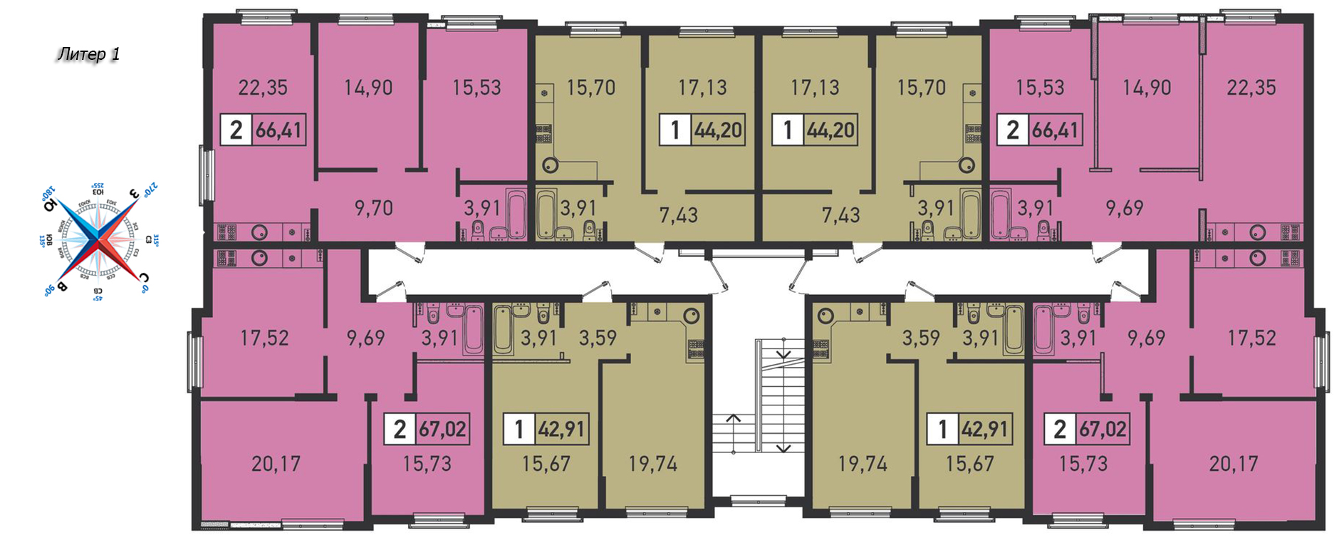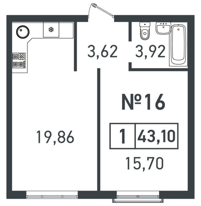 1 43.1 / 15.67 м² от 6 594 300 руб. (153 000 руб./м²) Планировка