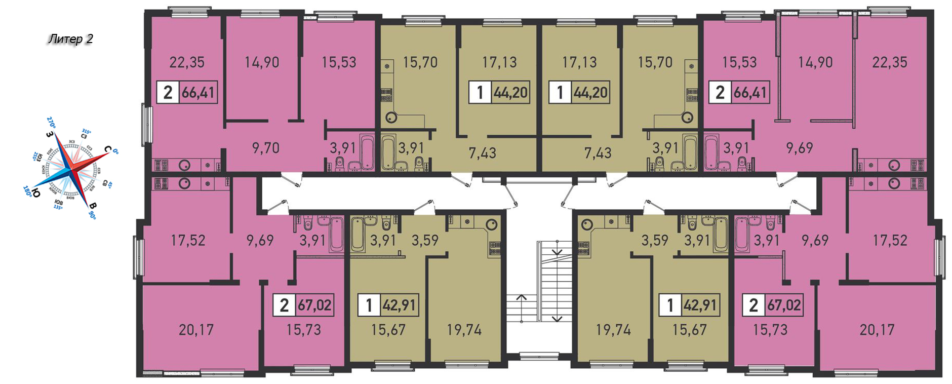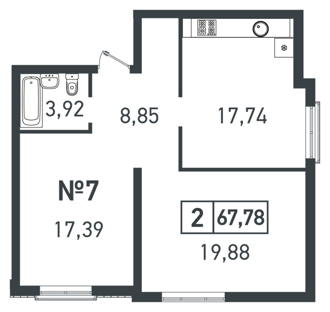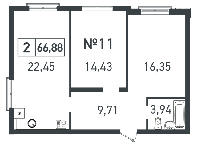 2 66.88 / 30.78 м² от 8 895 040 руб. (133 000 руб./м²) Планировка