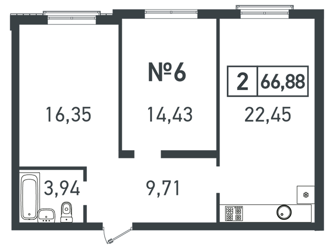2 66.88 / 30.78 м² от 10 032 000 руб. (150 000 руб./м²) Планировка