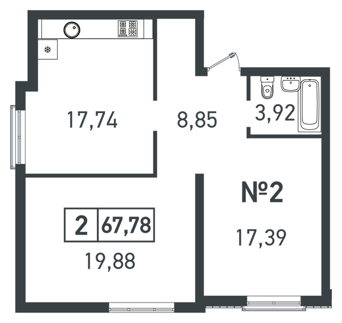 2 67.78 / 37.27 м² от 9 489 200 руб. (140 000 руб./м²) Планировка