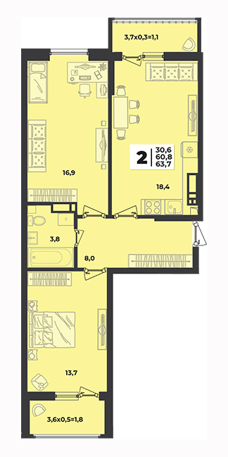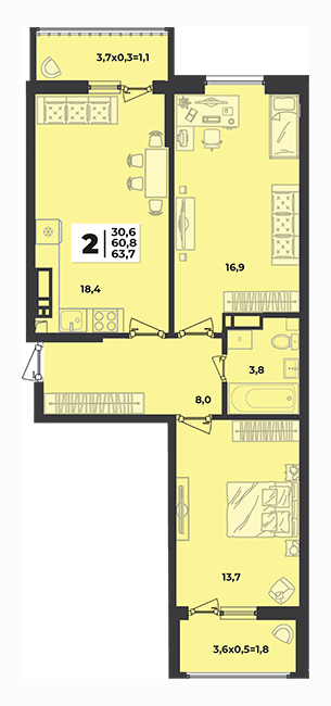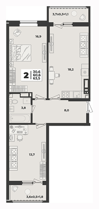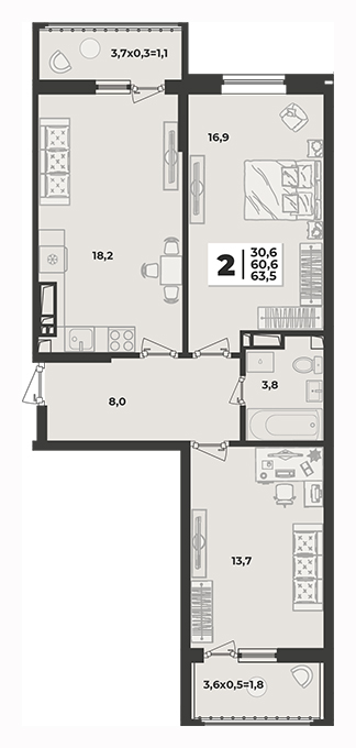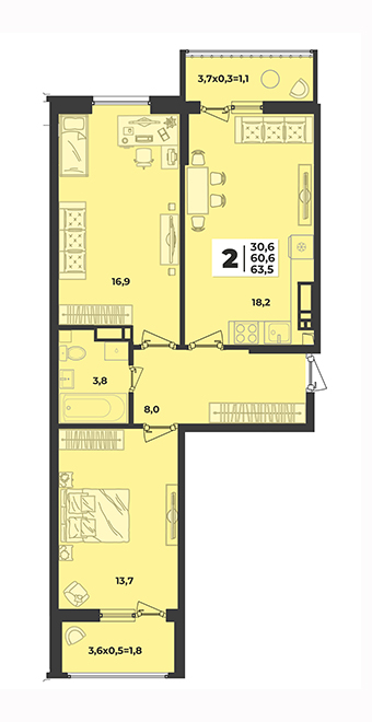 | 2 | 63.5 / 30.6 м² | от 8 643 300 руб. (136 115 руб./м²) | Планировка |