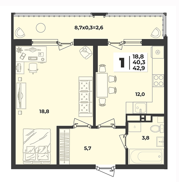| 1 | 42.9 / 18.8 м² | от 6 712 400 руб. (156 466 руб./м²) | Планировка | |
