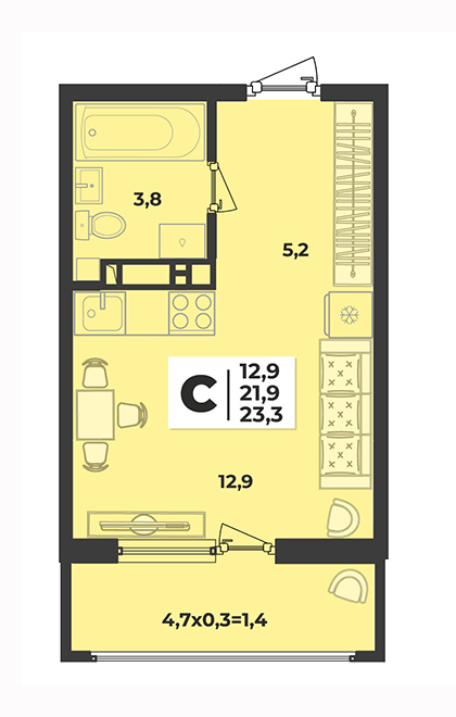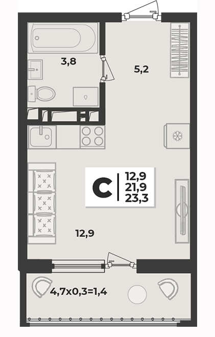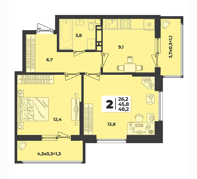 По плану предусмотрена сдача объекта недвижимости в 4-м квартале 2024 года. Клиентам предлагают студии, одно- и двухкомнатные квартиры с площадью от 23,1 до 48,1 м кв. Лоджии застеклены от пола до потолка. Балконы – открытые.