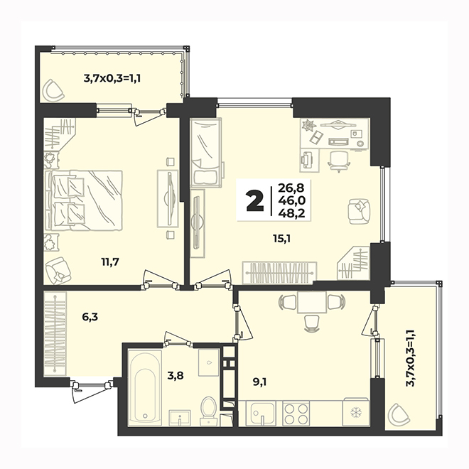 | 2 | 48.2 / 26.2 м² | от 7 327 120 руб. (152 015 руб./м²) | Планировка | |