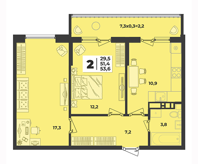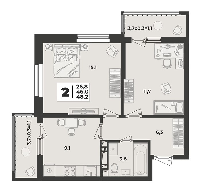 | 2 | 48.2 / 26.8 м² | от 7 442 800 руб. (154 415 руб./м²) | Планировка | |