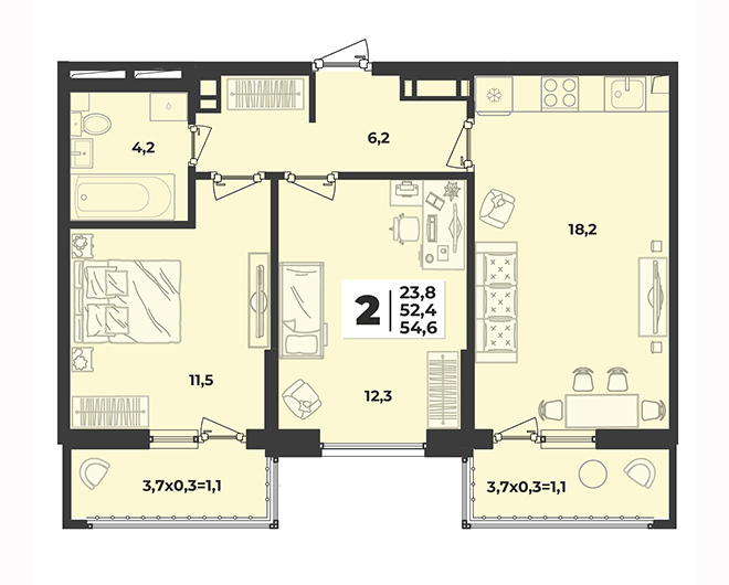 | 2 | 54.6 / 23.8 м² | от 7 931 540 руб. (145 266 руб./м²) | Планировка |