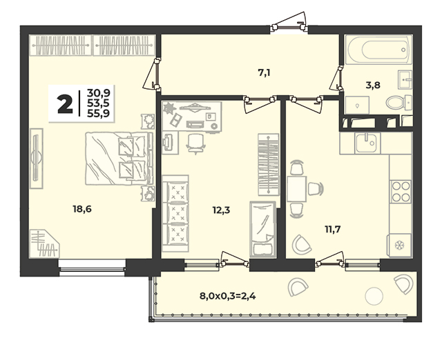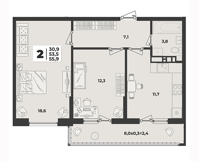| 2 | 55.9 / 30.9 м² | от 8 287 610 руб. (148 258 руб./м²) | Планировка | |