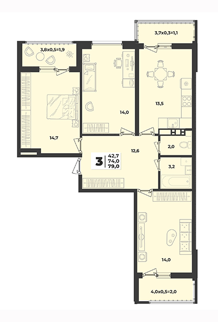 | 3 | 79.0 / 42.7 м² | от 10 819 300 руб. (136 953 руб./м²) | Планировка | |