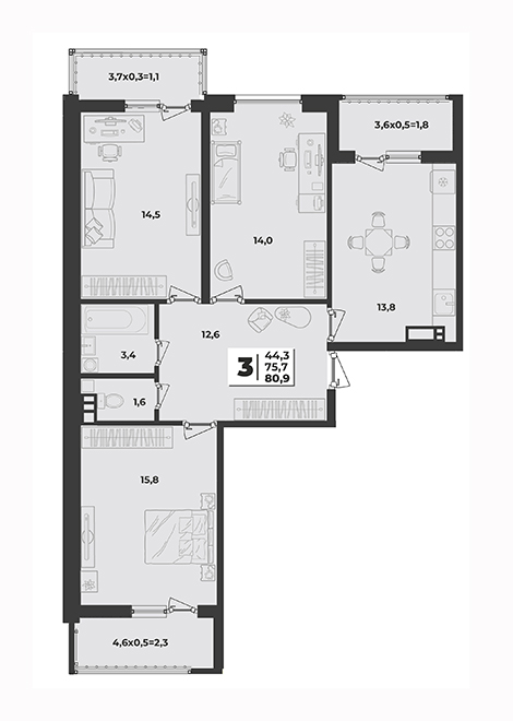 | 3 | 80.9 / 44.3 м² | от 11 079 030 руб. (136 947 руб./м²) | Планировка |