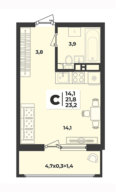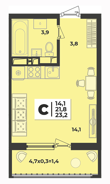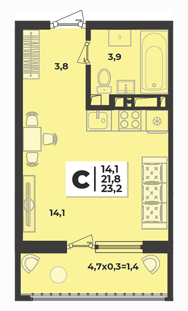 | 1 | 23.2 / 14.1 м² | от 4 186 720 руб. (180 462 руб./м²) | Планировка | |