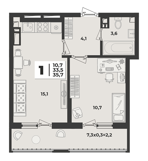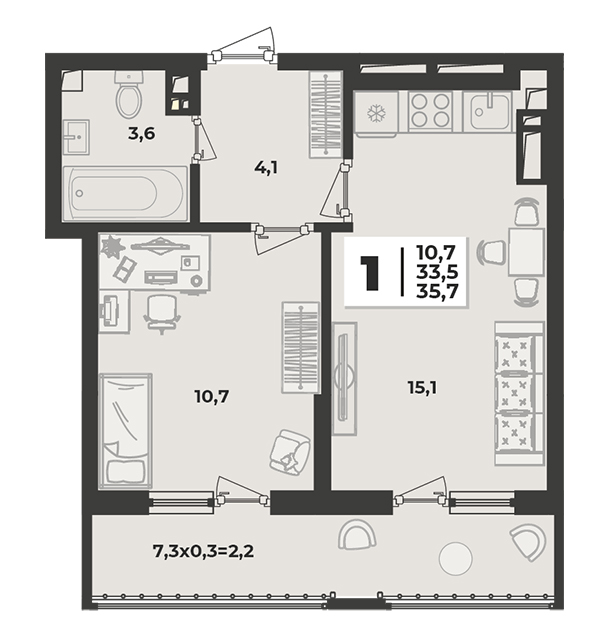 | 1 | 35.7 / 10.7 м² | от 6 081 860 руб. (170 360 руб./м²) | Планировка | |