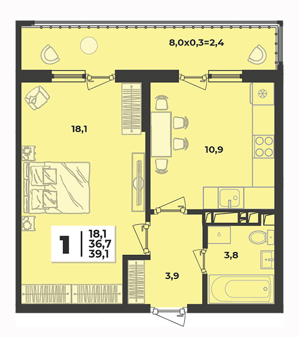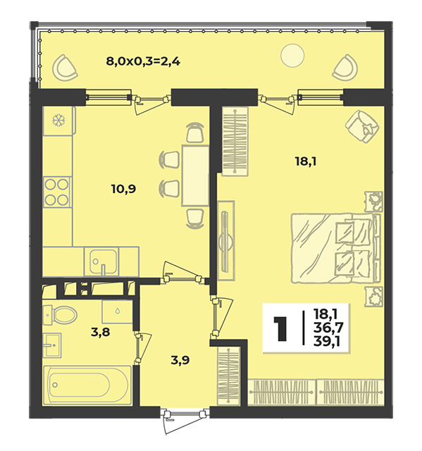 | 1 | 39.1 / 18.1 м² | от 6 279 910 руб. (160 612 руб./м²) | Планировка | |
