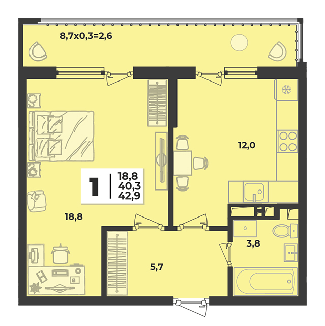 | 1 | 42.9 / 18.8 м² | от 6 497 900 руб. (151 466 руб./м²) | Планировка | |