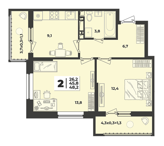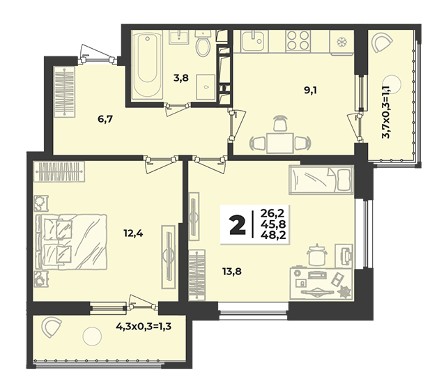 | 2 | 48.2 / 26.2 м² | от 6 334 200 руб. (131 415 руб./м²) | Планировка |