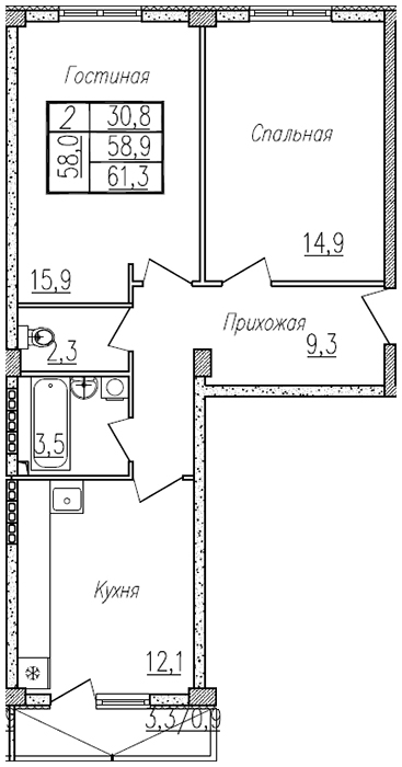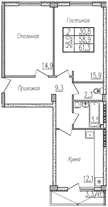 | 2 | 61.20 / 30.8 м² | от 5 501 880 руб. (89 900 руб./м²) | Планировка |
