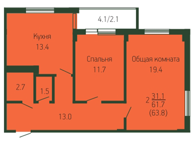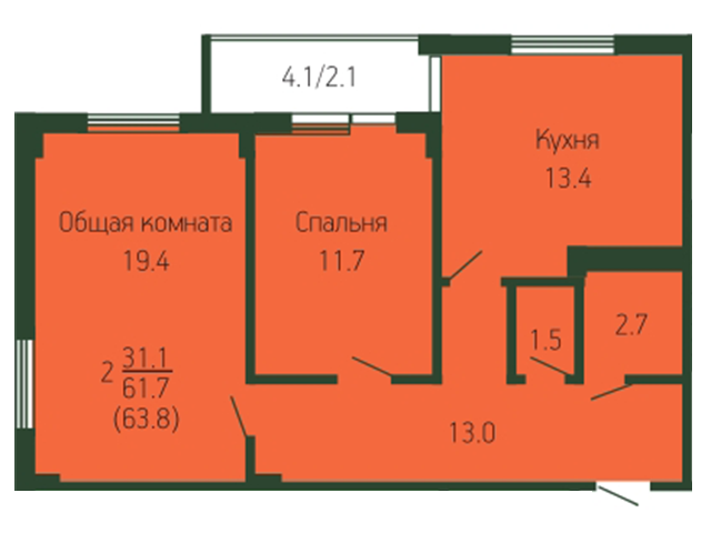 2 63.8 / 31.1 м² от 6 750 000 руб. (105 799 руб./м²) Планировка