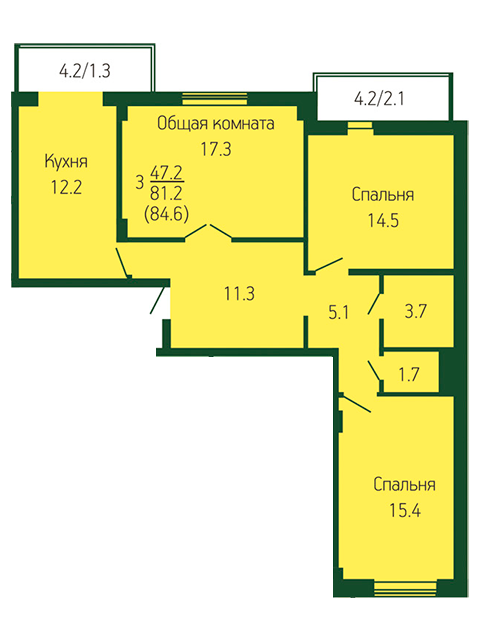 3 84.5 / 47.2 м² от 8 500 000 руб. (100 592 руб./м²) Планировка