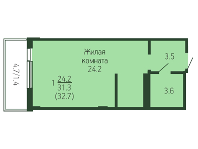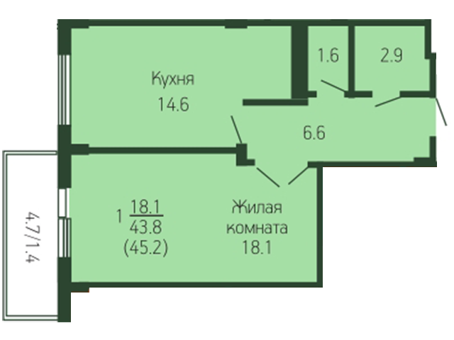 1 45.2 / 18.1 м² от 5 600 000 руб. (123 894 руб./м²) Планировка