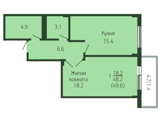 1 49.6 / 18.2 м² от 5 920 000 руб. (119 355 руб./м²) Планировка