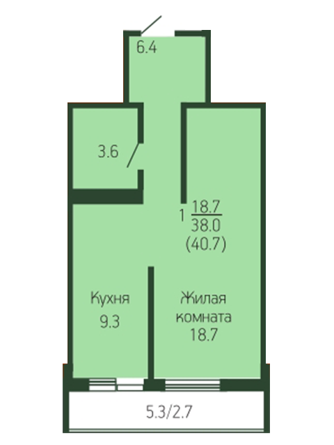 1 40.7 / 18.7 м² от 5 020 000 руб. (123 342 руб./м²) Планировка