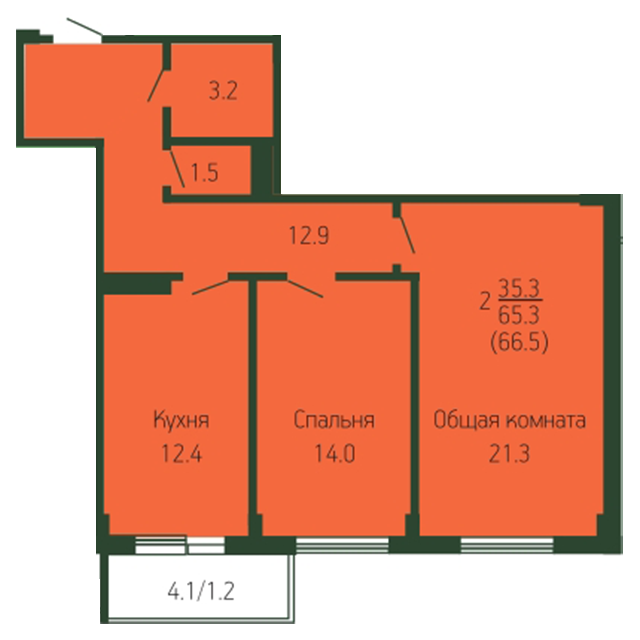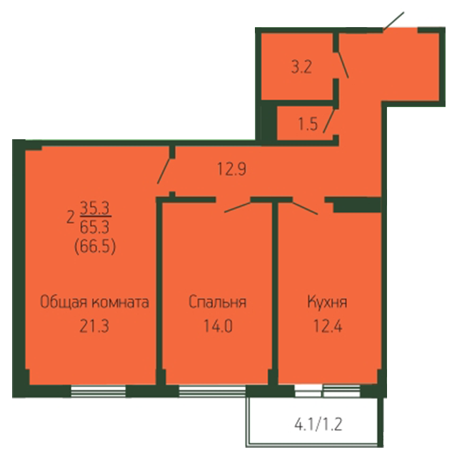 2 66.5 / 35.3 м² от 6 950 000 руб. (104 511 руб./м²) Планировка