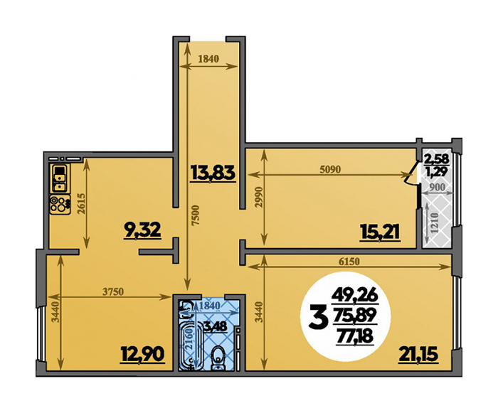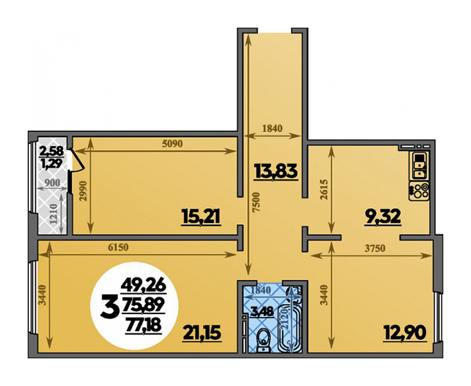 | 3 | 77.18 / 49.26 м² | от 7 494 620 руб. (97 106 руб./м²) | Планировка |