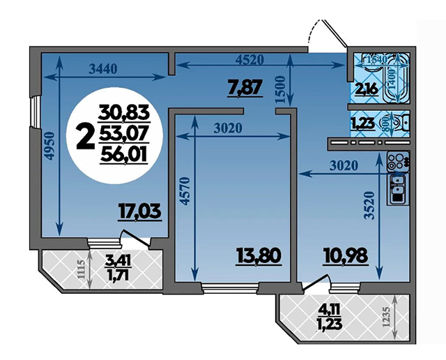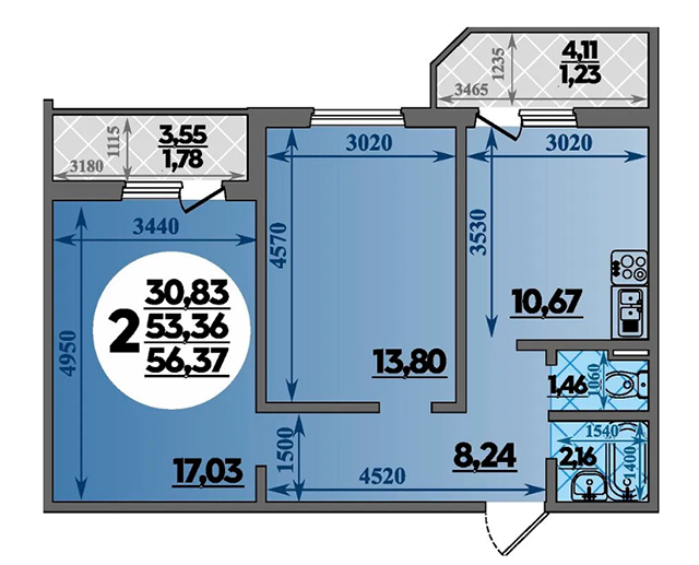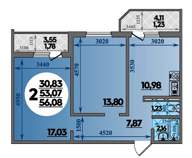| 2 | 56.08 / 30.83 м² | от 6 011 776 руб. (107 200 руб./м²) | Планировка | |