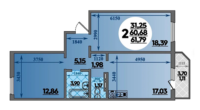 | 2 | 61.79 / 31.25 м² | от 6 018 346 руб. (97 400 руб./м²) | Планировка | |