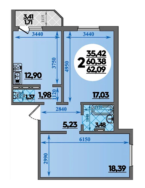 | 2 | 62.09 / 35.42 м² | от 6 271 090 руб. (101 000 руб./м²) | Планировка | |