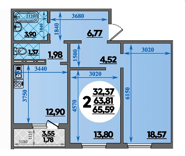 | 2 | 65.59 / 32.37 м² | от 6 191 696 руб. (94 400 руб./м²) | Планировка | |