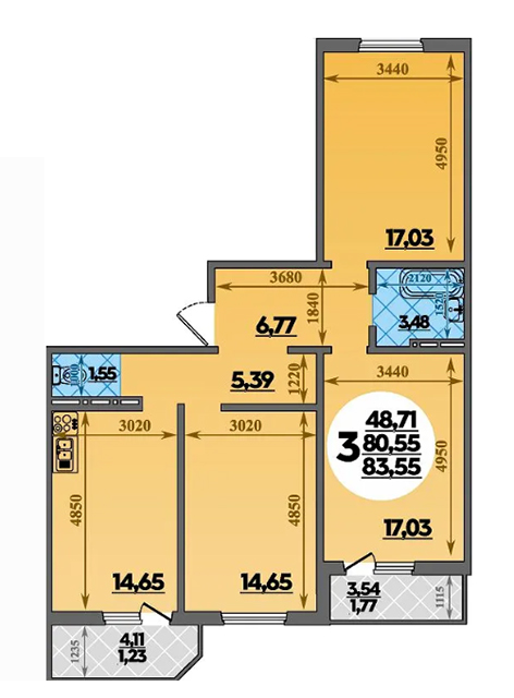 | 3 | 83.55 / 48.71 м² | от 7 661 535 руб. (91 700 руб./м²) | Планировка |