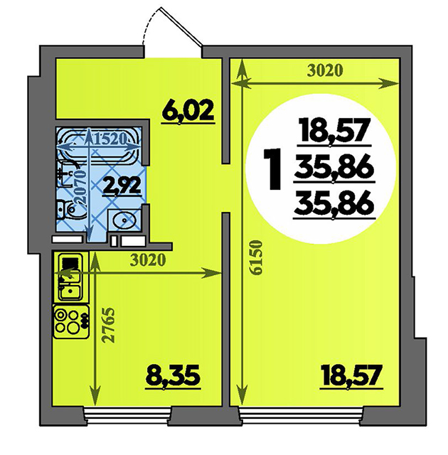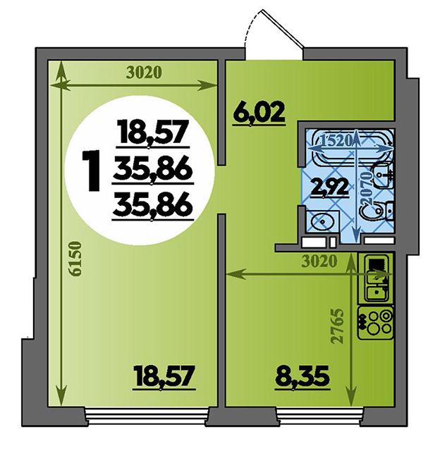| 1 | 35.86 / 18.57 м² | от 3 854 950 руб. (107 500 руб./м²) | Планировка | |