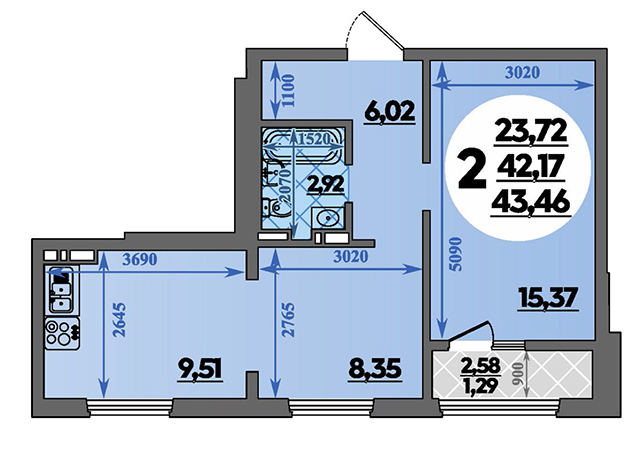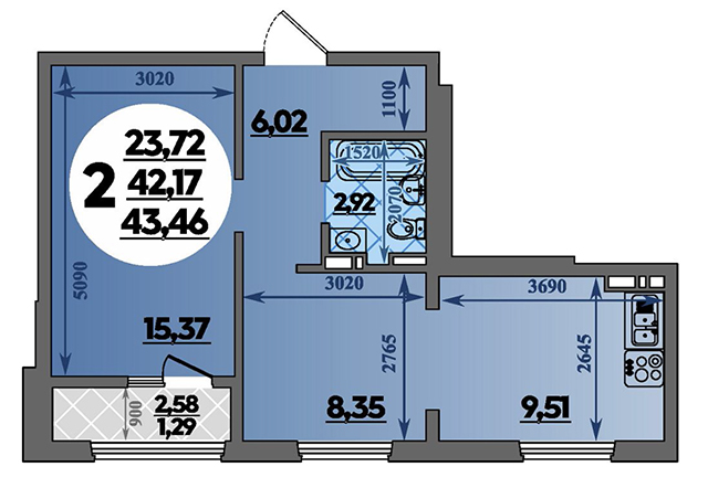| 2 | 43.46 / 23.72 м² | от 4 585 030 руб. (105 500 руб./м²) | Планировка | |