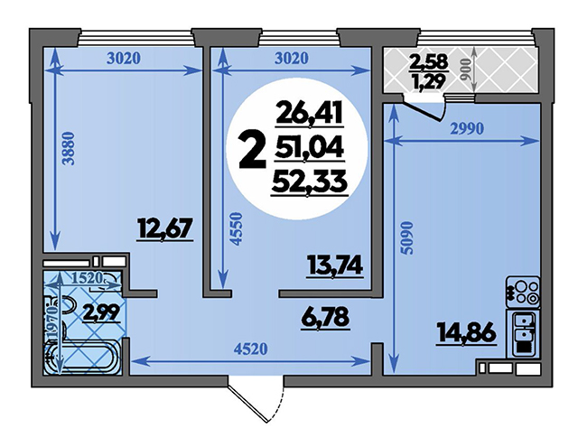 | 2 | 52.33 / 26.41 м² | от 5 510 349 руб. (105 300 руб./м²) | Планировка | |