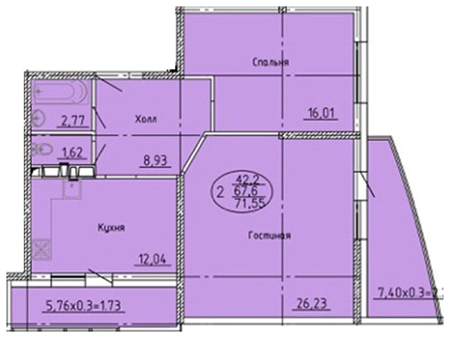 | 2 | 72.75 / 42.2 м² | от 8 453 550 руб. (116 200 руб./м²) | Планировка | |