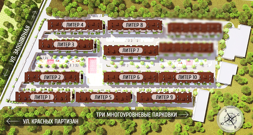 Дворы обустроены детскими и игровыми площадками. Территория будет закрытой. Идёт строительство четырёхэтажного паркинга.