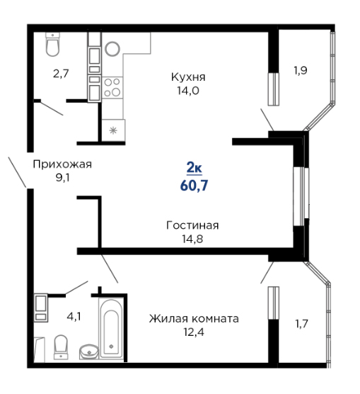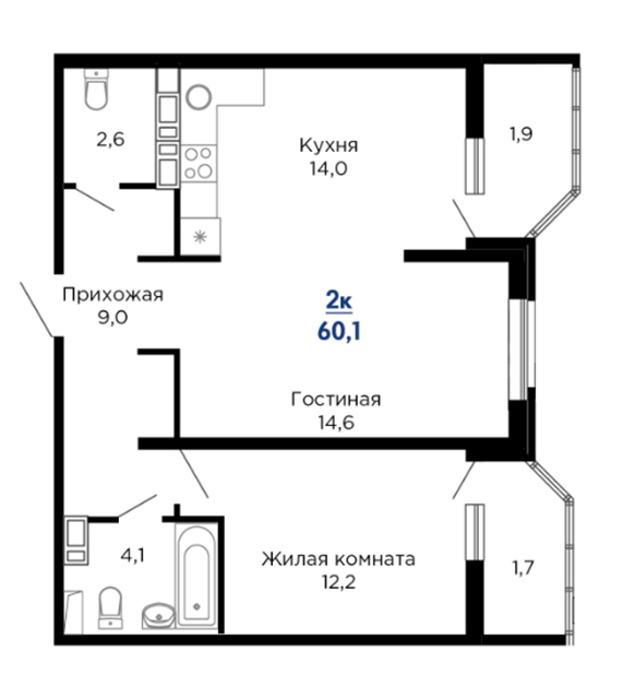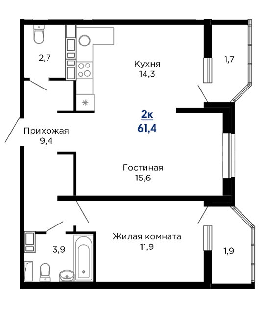 | 2 | 61.5 / 26.8 м² | от 9 108 150 руб. (148 100 руб./м²) | Планировка | |