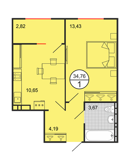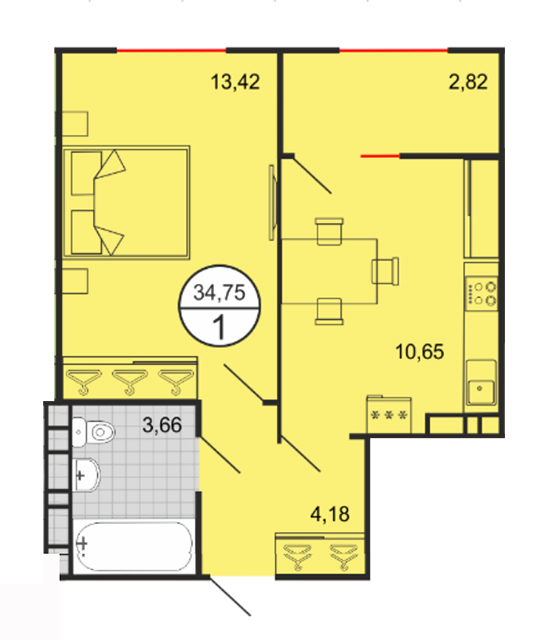 | 1 | 34.62 / 13.67 м² | от 4 396 740 руб. (127 000 руб./м²) | Планировка | |