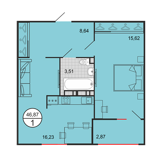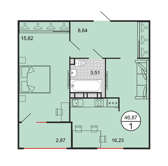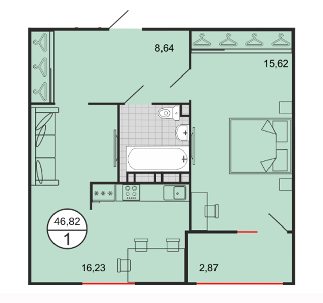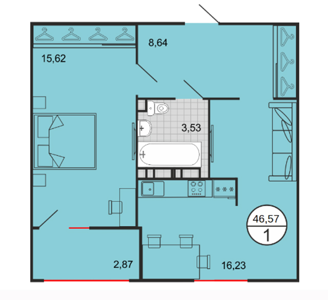 | 1 | 46.57 / 15.62 м² | от 5 914 390 руб. (127 000 руб./м²) | Планировка | |