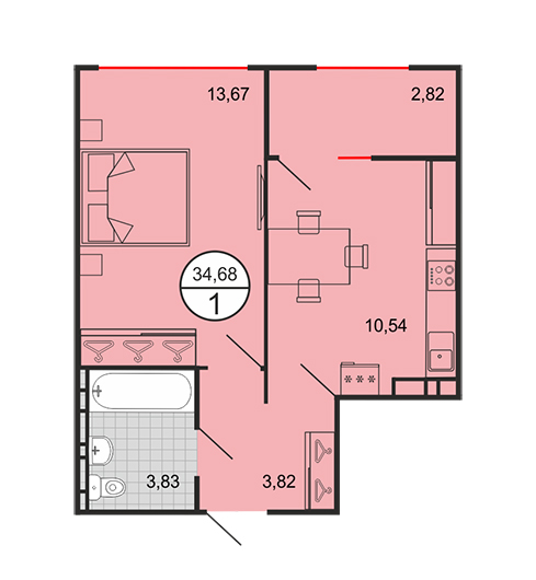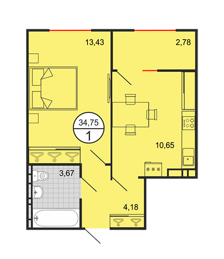 | 1 | 34.68 / 13.67 м² | от 4 404 360 руб. (127 000 руб./м²) | Планировка | |
